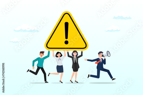 Business people carrying attention sign with loud speaker, attention message announcement, important communication or advertisement, beware warning, careful symbol or urgent notification (Vector)