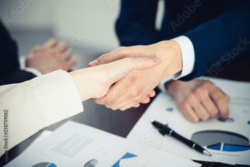 Business people shaking hands finishing up a meeting. Handshake at successful negotiation