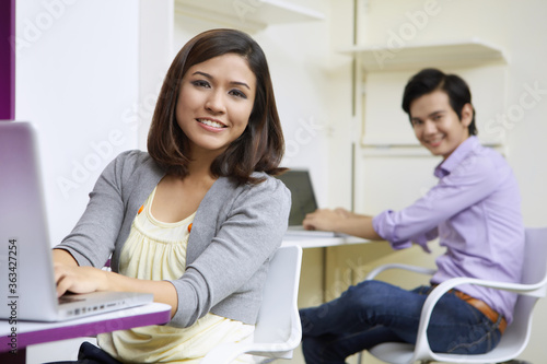 sitting, smiling, front view, half face, waist up, corporate, professional, executive, occupation, togetherness, cheerful, confidence, happiness, contentment, career, connection, communication, wireless technology, technology, accessibility, portability, asian ethnicity, missy, young men, selective focus, two people, well-dressed, laptop, toothy smile, adults only, businesswoman, businessman, indoor, business