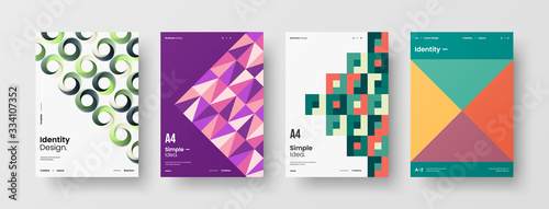 Business presentation vector A4 vertical orientation front page mock up set. Corporate report cover abstract geometric illustration design layout bundle. Company identity brochure template collection.