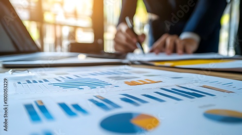 Business professional analyzing data charts and reports in a modern office environment with a focus on growth and strategy.
