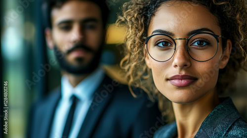 Business professional portrait: Confident woman with glasses and a blurred suited man in the background.