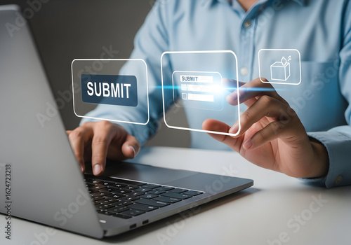 Business Professional Submitting Online Form on Laptop with Digital Interface Elements
