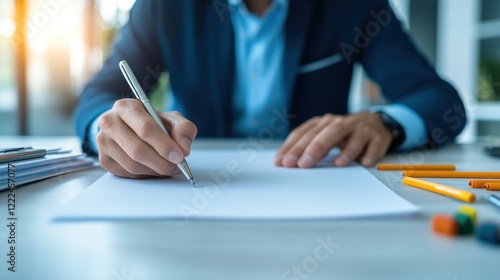 Business professional writing notes office environment indoor setting close-up view productivity focus