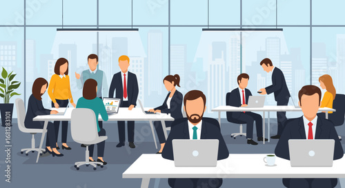 Business professionals collaborating and working productively in a modern corporate office with city views. Ideal for concepts of teamwork, success, and enterprise.