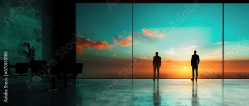 Business Professionals Observing Sunset Through Large Office Window with Modern Interior Design