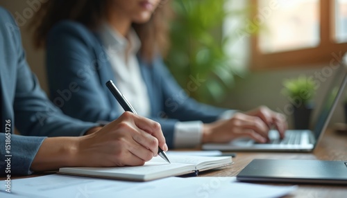 Business professionals taking notes during online course. Laptop, notebook, pen on wooden desk. Online education, work, communication. Modern tech, distance learning, business meeting concept.