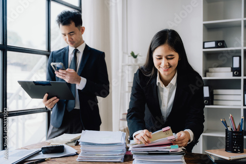 business, office, teamwork, collaboration, workplace, professional, young adult, asian ethnicity, working, document, paperwork, desk, corporate, modern, interior, smiling, success, achievement, confident, planning, strategy, communication, technology, smartphone, file, binder, organisation, management, finance, accounting, analysis, report, datum, information, project, meeting, discussion, window, light, bright, cheerful, positive, together, cooperation, employee, job, career, occupation