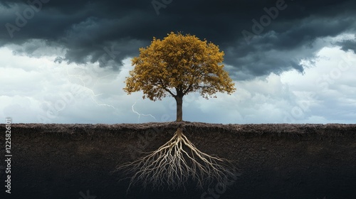Business resilience strategies shown through a sturdy tree enduring a storm, emphasizing roots representing stability and strength amid challenges.