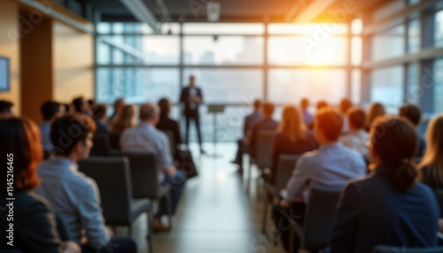 Business seminar in progress. Attendees listen to speaker. Blurred view of people in a meeting room. Event takes place indoors. Modern office setting. Pro development. Learning in progress.