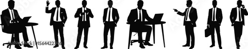 Business silhouette vector featuring office professionals in poses such as sitting at a desk, presenting, and shaking hands.