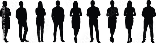 Business silhouettes, male and female professionals, standing in row, corporate attire, black and white vector, team concept, workplace diversity illustration