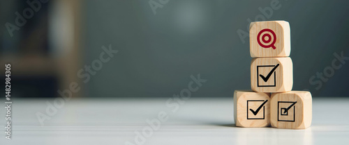 Business Strategy Planning & Quality Management: Quality Control Assessment Workflow Development with Target Goal Icon & Checklist on Wooden Block - Empty Space Left