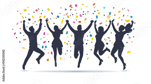 Business team celebrating success with jumping silhouettes and confetti. Vector icon