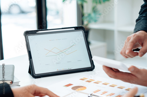 Business team meeting to conference, collaboration discussing working analyzing with financial data and marketing business strategy project, presentation and brainstorming to making profit of company