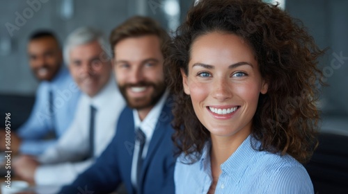 Business Team Portrait: A close-up portrait of a smiling businesswoman with her team in the background, signifying leadership, teamwork, and a thriving business environment.