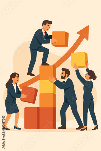 Business team working together, building with blocks along an upward arrow. Concept of teamwork, collaboration, growth, and success. Corporate development and progress vector.