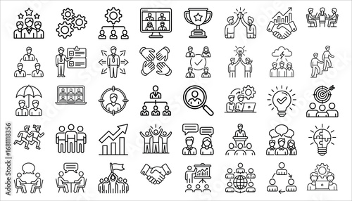 Business Teamwork and Leadership Icons Set. Collaboration, Management, Success, Partnership, Corporate Line Art Vector