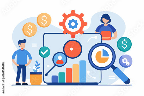 Business teamwork concept illustration featuring a diverse group of professionals discussing strategy in front of a colorful puzzle board with infographic elements like graphs, pie charts, and gears.
