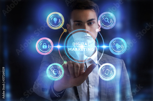 Business, Technology, Internet and network concept. Young businessman working on a virtual screen of the future and sees the inscription:
