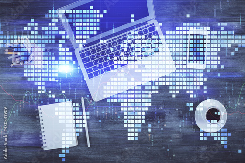 Business theme hologram drawings over computer on the desktop background. Top view. Multi exposure. Concept of international connections.