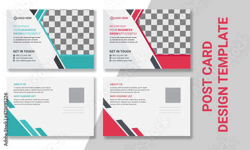 Business vector postcard design template. horizontal layout. right side for a place of a photo.