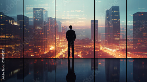 "Business Visionary: Silhouette of a Confident Businessman Overlooking the Cityscape at Dusk"