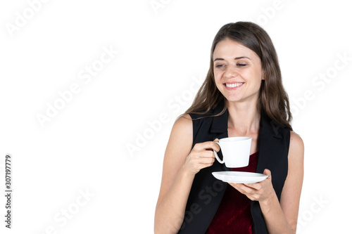 Business woman drink coffee, hold white coffee cup. White background. Isolated.