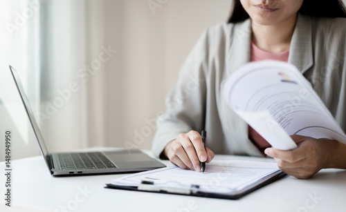 Business woman employer holding resume hiring recruit looking cv resume to hire candidates, analyzing information before job interview. Recruitment concepts