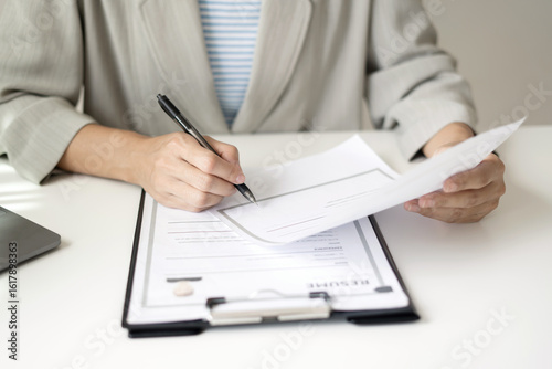Business woman employer holding resume hiring recruit looking cv resume to hire candidates, analyzing information before job interview. Recruitment concepts