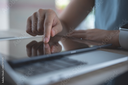 Business woman finger touching on digital tablet and working on laptop computer on office table