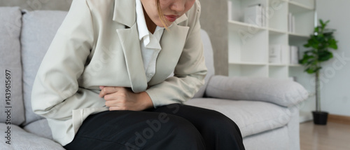 Business woman have stomach ache. Stomach ache due to eating irregularly, menstrual cramps, flatulence, diarrhea, bloating, bloating, abdominal inflammation, food poisoning, constipation.