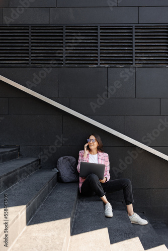 business woman in pink jacket is sitting on steps and working on laptop and talking on phone, entrepreneur. startup female is successful and confident, interviewing, negotiating with partners