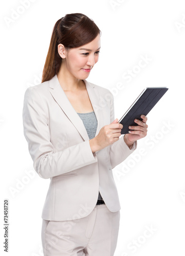 woman, lady, girl, female, japanese, korean, chinese, asia, asian, business, businesswoman, suit, corporate, executive, officer, adviser, profession, secretary, manager, assistant, boss, write, pen, jot, down, record, tablet, pad, digital, computer, portable, read, sharpened, look, condensed, isolated, white, background, people, portrait, 1, studio, beautiful, pretty, smile, happy, middle, age, mature, senior