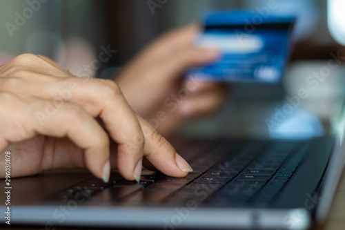 business woman make online payment and pay bill by using computer notebook and credit card at home. Internet banking,online shopping concept.