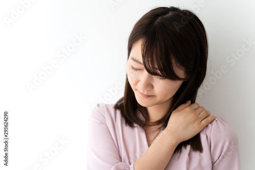 woman, portrait, young, lovely, business, beauty, white, isolated, brunette, happy, businesswoman, face, person, people, look, hair, 1, sweet, model, lady, merry, studio, massage, fatigue, fatigue, cephalalgia, arduous, ol, work, japanese, asian, rest, rest, break, white background
