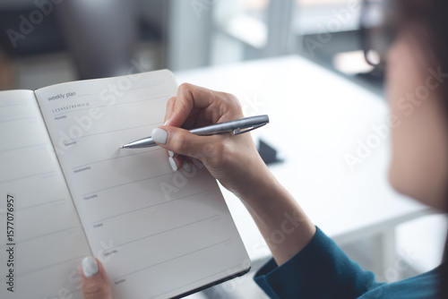 Business woman planning work event on weekly schedule notebook, close up. Business event planning, timetable agenda plan