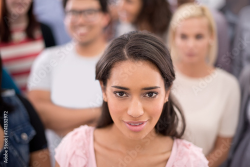 Business woman, portrait and smile in group, teamwork or colleagues with diversity in office. Staff, employees and girl with people with solidarity, professional and career with pride in workplace