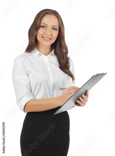 isolated, expertise, woman, clipboard, businesswoman, businessperson, suit, smiling, cheerful, young adult, surveillance, success, white background, service, occupation, signing, adult, satisfaction, isolated on white, professional occupation, manager, happiness, business, aspiration, ceo, shirt, well-dressed, achievement, office worker, office, contract, copy space, blank, note
