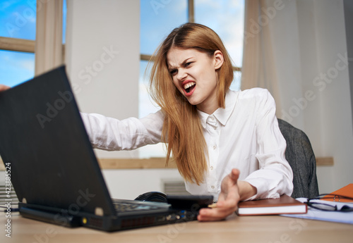 business woman working desk laptop in office emotions dissatisfaction communication