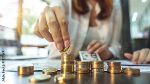 Business women put coin stack money and many bank note in office, Save money for future and Retirement.