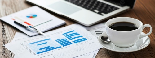 Business Workplace Coffee Charts Laptop and Financial Reports on Wooden Desk