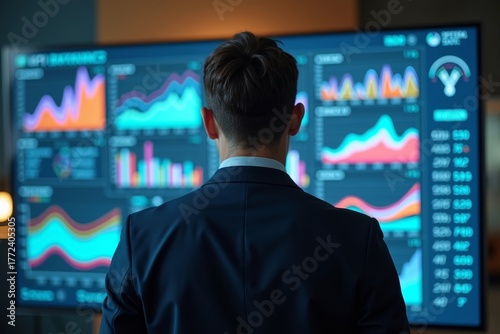 Businessman Analyzing Colorful KPI Data Charts on Interactive Screen