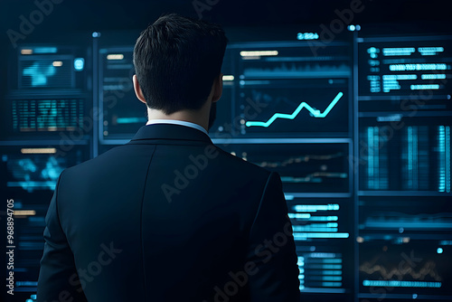 Businessman Analyzing Data on Digital Screens in High-Tech Control Room