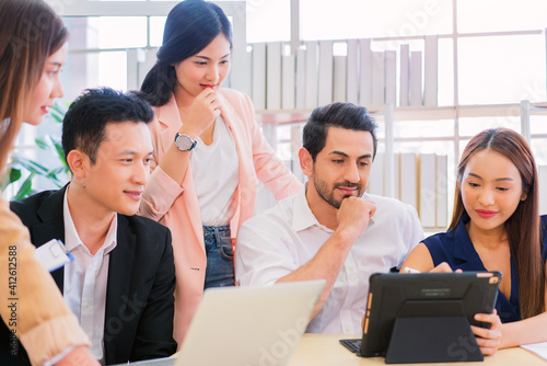 businessman and secretary with team business working together using laptop computer at modern office, Lifestyle business work at home concept.