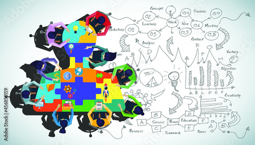 Businessman and woman brainstorm success with jigsaw human head, plan,think,search,analyze,communicate, futuristic idea innovation technology modern.vector