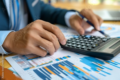 Businessman calculating financial figures with a calculator at desk for accounting purposes