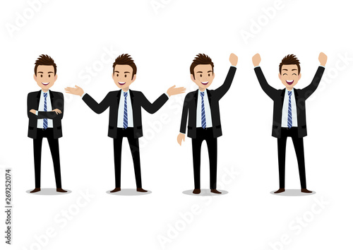 Businessman cartoon character, set of four poses. Handsome business man in office style smart suit . Vector illustration