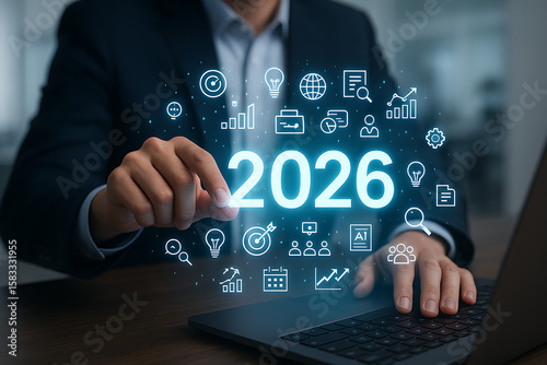 Businessman clicking on digital 2026 future year with floating icons representing business planning data management strategy success global vision digital economy and marketing