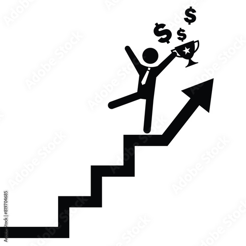 Businessman Climbing Arrow Graph, Reaching the Top, Winning Trophy and Earning Lots of Dollars Silhouette Icon Symbol